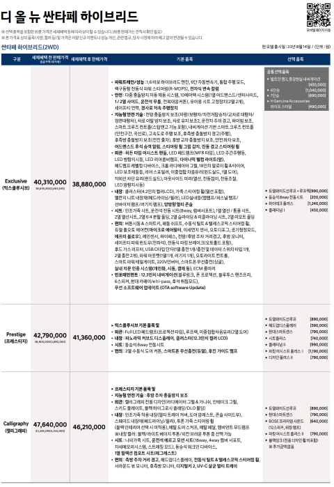 기존 싼타페에 비해 가격이 269만 원(2.5 터보 기준) 상승했지만 그만큼 기본 옵션이 많이 적용되었습니다.