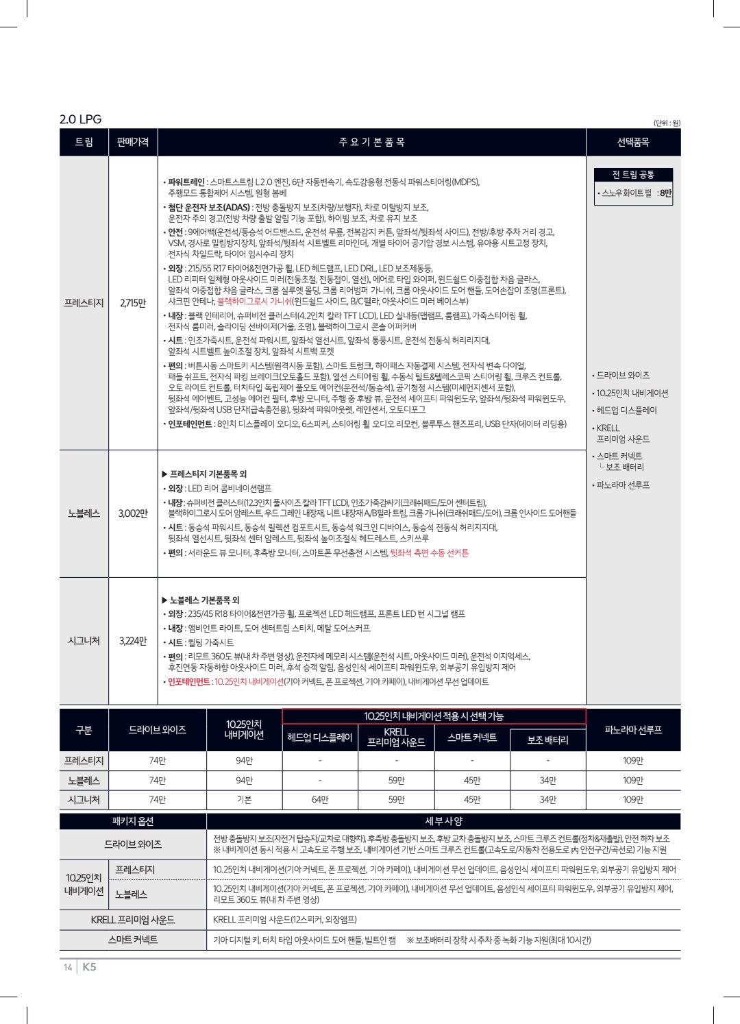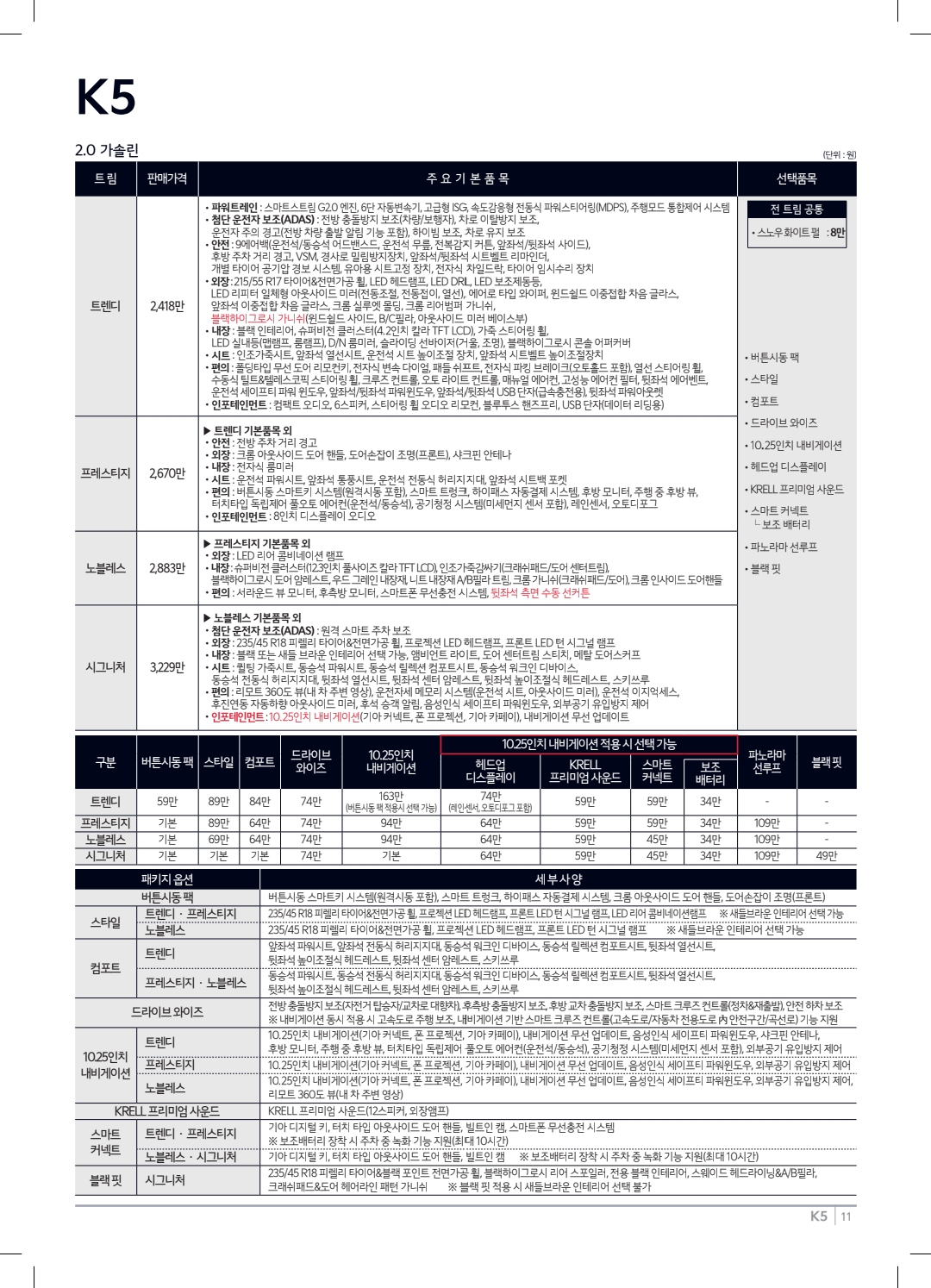 옵션 : 컴포트(119만 원), 드라이브 와이즈(74만 원), 클러스터 팩(104만 원)