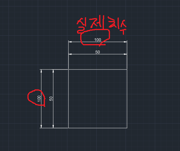 위 사진처럼 실제 치수는 100x100 사각형인데 50x50이라고 치수가 찍히는 경우가 있습니다.
