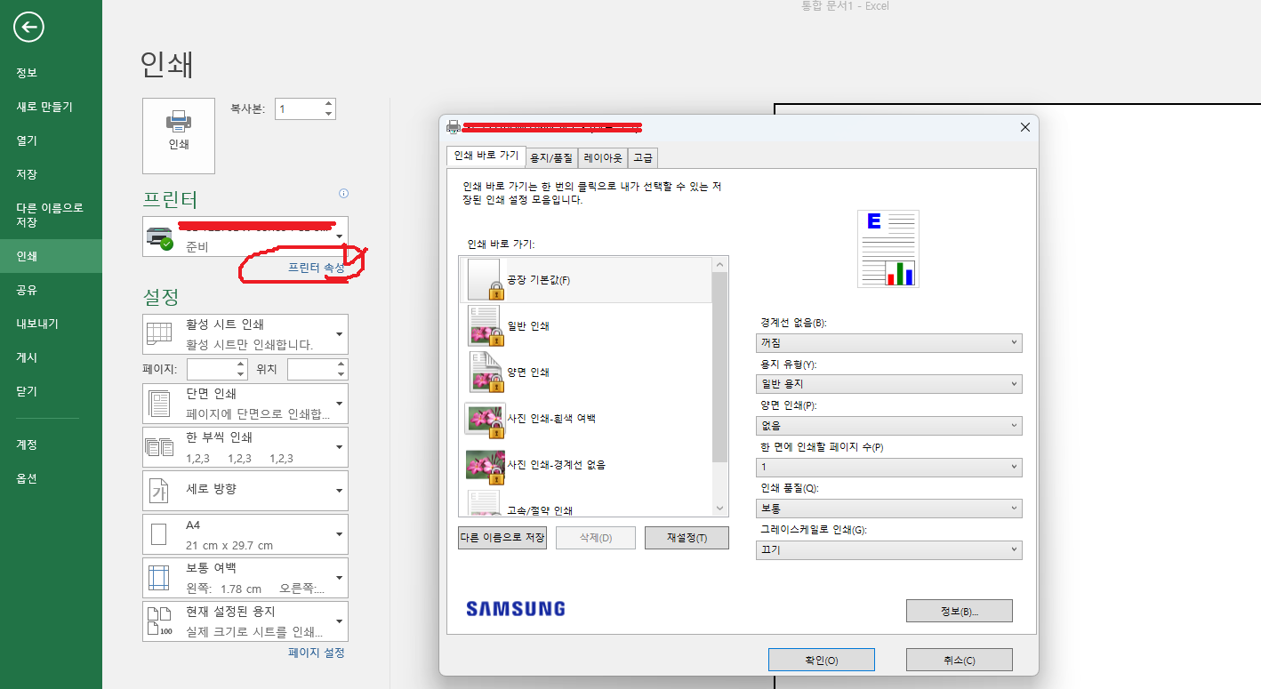 해결방법1에서 일반인쇄로 설정하여도 레이아웃 들어오셔서 별도로 양면 인쇄 체크 해제를 꼭 해주셔야 합니다.