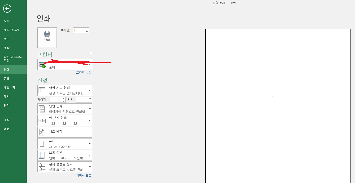 2. 엑셀창 연 후에 Ctrl + P 단축키를 누르면 바로 인쇄설정으로 바로 화면이 전환됩니다.