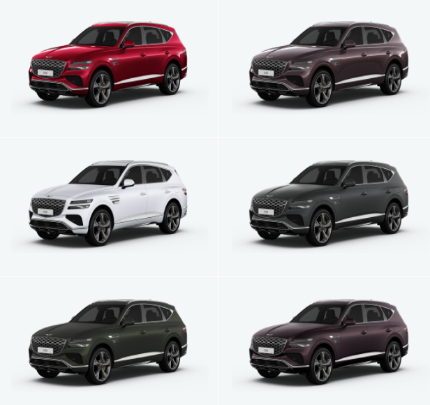 2024 GV80 색상은 우유니 화이트, 세빌 실버, 마칼루 그레이, 비크 블랙, 스트로 그린, 카프리 블루, 마우나 레드, 바로사 버건디, 마테호른 화이트(무광), 마칼루 그레이(무광), 스트로 그린(무광), 바로사 버건디(무광)