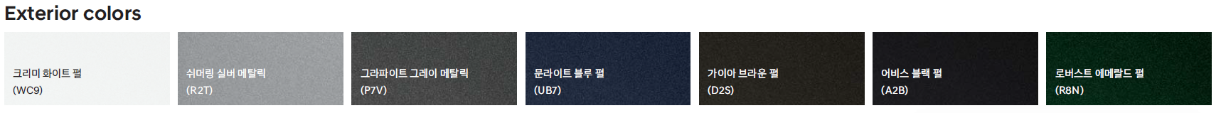 2024 팰리세이드 색상은 크리미 화이트 펄, 쉬머링 실버 메탈릭, 그라파이트 그레이 메탈릭, 문라이트 블루 펄, 가이아 브라운 펄, 어비스 블랙 펄, 로버스트 에메랄드 펄