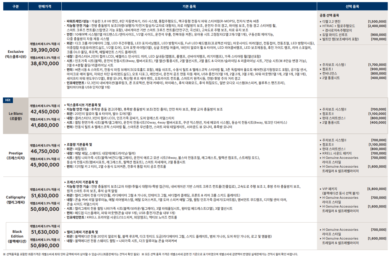 2024 팰리세이드의 등급은 익스클루시브, 르블랑, 프레스티지, 캘리그래피, 블랙에디션까지 총 5가지 등급이 있습니다.