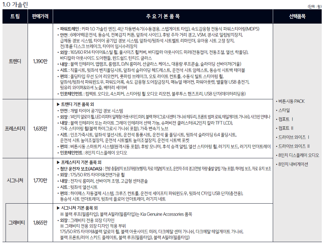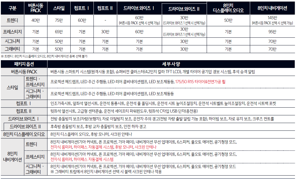그중에서 가성비용 경차답게 역시 프레스티지에 무옵션이 가장 가성비 있게 구매하는 거라고 생각합니다