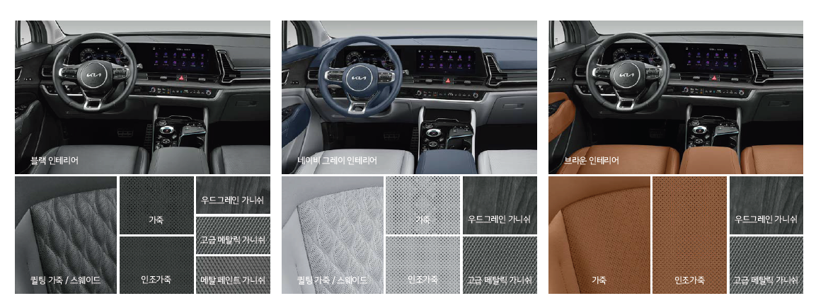 실내 색상은 블랙 인테리어, 네이비 그레이 인테리어, 브라운 인테리어 3가지로 구성되어 있습니다.