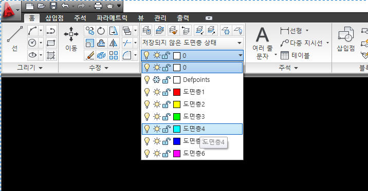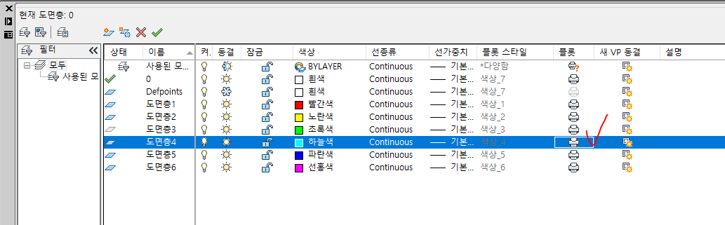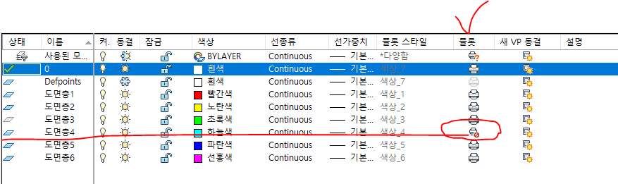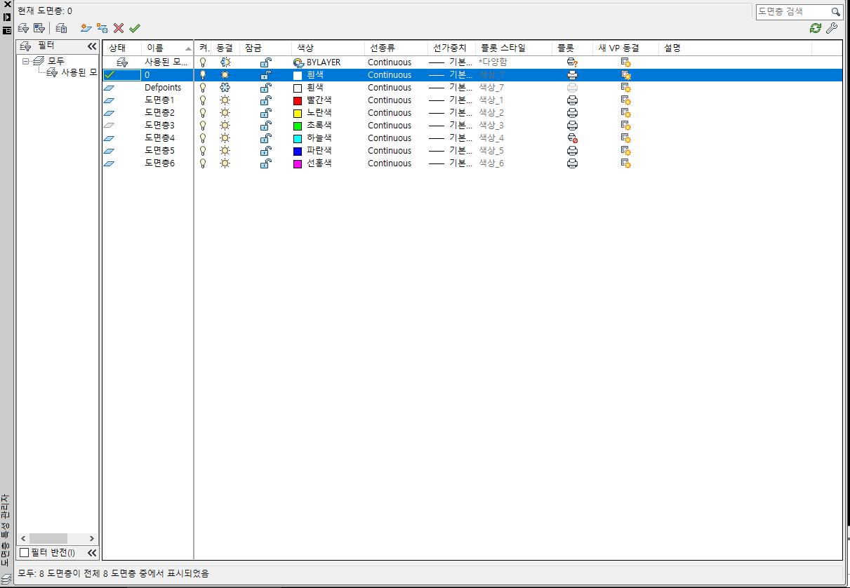 명령어 LAYER 엔터를 눌러주시면 도면층 특성 관리자 라는 창이 나오는데요