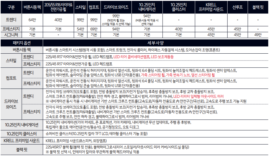 가성비로 구매를 고려하시는 분들은 트렌디 트림에 버튼시동 팩 옵션을 추가하면 후회 없이 가성비 있게 차량을 구매하실 수 있습니다.