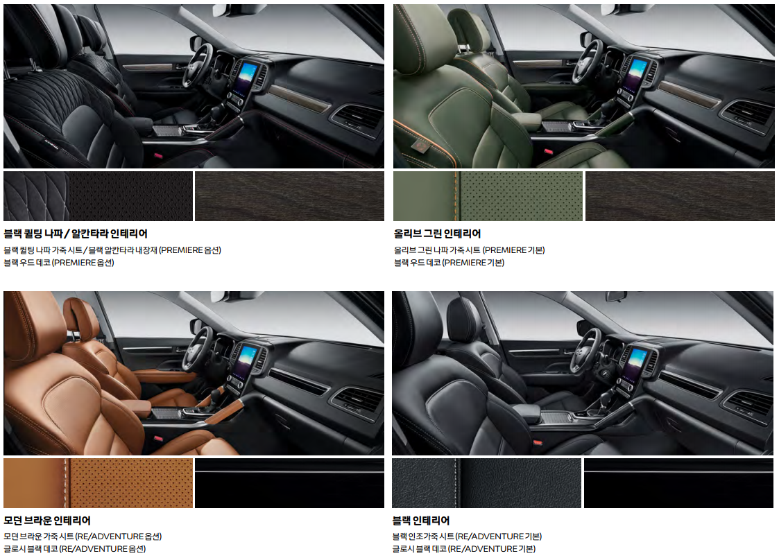 2024 QM6의 실내 색상은 블랙 퀼팅 나파/알칸타라 인테리어, 올리브 그린 인테리어, 모던브라운 인테리어, 블랙 인테리어, 그레이 인테리어로 총 5가지 색상을 보유하고 있습니다.