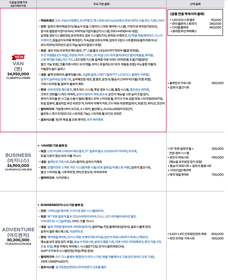 가성비로 생각하시는 분들은 밴 트림에 열선시트만 넣어서 타면 충분히 가성비 있게 차량을 구매하실 수 있습니다.
