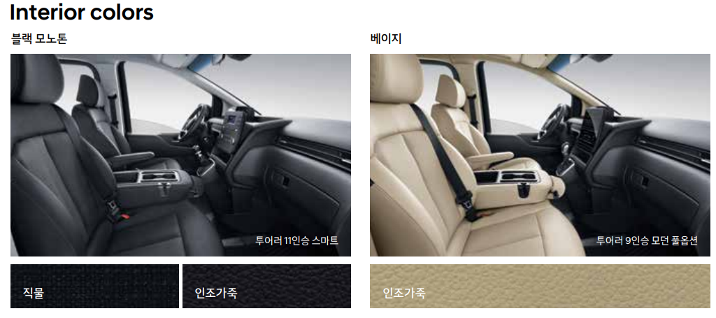 2024 스타리아 하이브리드 내장 색상은 블랙 모노톤, 베이지 두 가지 색상으로 구성되어 있습니다.