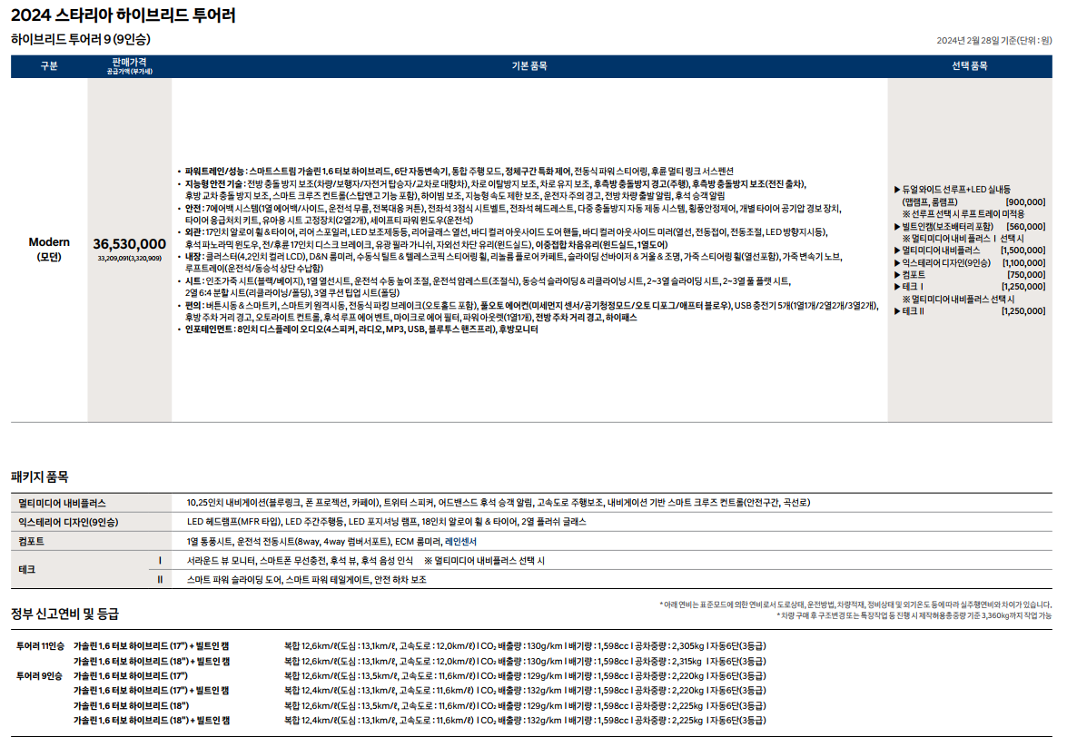 2024 스타리아 하이브리드 정보 및 제원