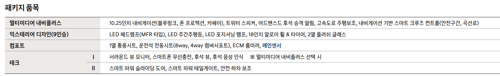 투어러 트림 옵션 : 듀얼와이드 선루프, 실내등, 빌트인 캠(보조배터리 포함), 멀티미디어 내비플러스, 익스테리어 디자인, 컴포트, 테크 1, 테크 2로 구성되어 있습니다.