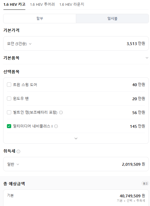카고 트림의 옵션 (가성비 옵션) 추천은 멀티미디어 내비플러스, 컴포트, 테크 옵션을 선택하겠습니다.