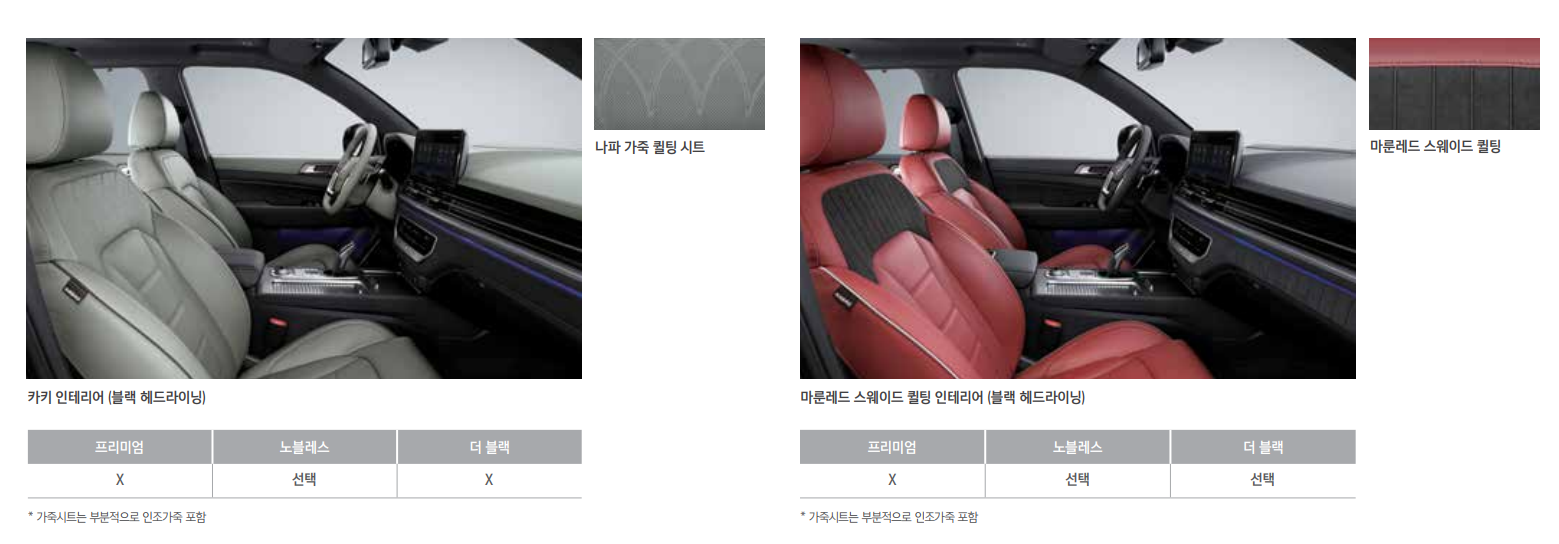 2024 렉스턴의 내장 색상은 블랙 인테리어, 클래시컬 베이지 인테리어, 카키 인테리어, 마룬레드 스웨이드 퀼팅 인테리어 색상으로 총 4가지 색상으로 구성되어 있습니다.