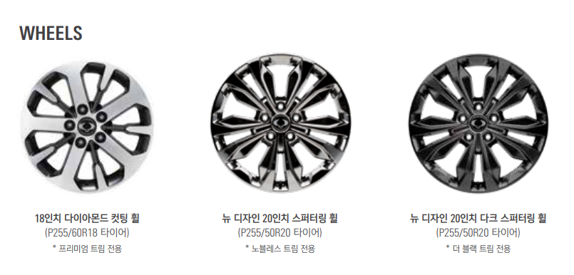 2024 렉스턴 휠은 18인치 다이아몬드 컷팅 휠, 뉴 디자인 20인치 스퍼터링 휠, 뉴 디자인 20인치 다크 스퍼터링 휠으로 구성되어 있습니다.