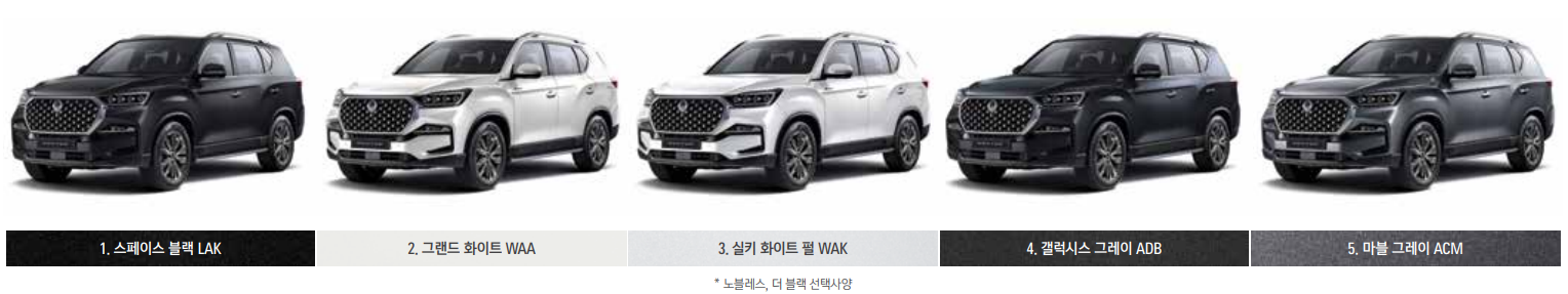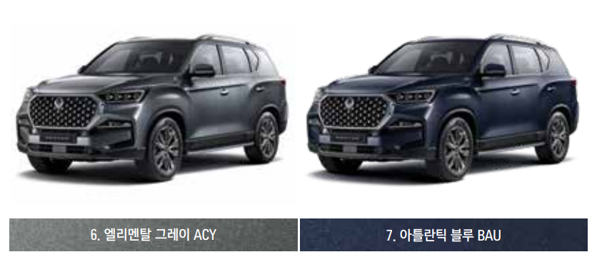 2024 렉스턴 색상은 그랜드 화이트, 엘리멘탈 그레이, 마블 그레이, 갤럭시스 그레이, 스페이스 블랙, 아틀란틱 블루, 실키 화이트 펄 색상으로 총 7가지로 구성되어 있습니다.