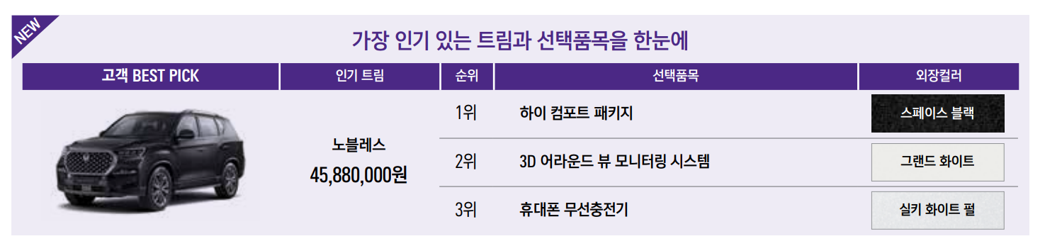 2024 렉스턴의 인기 트림은 노블레스 트림이며, 인기 색상은 스페이스 블랙 색상입니다.