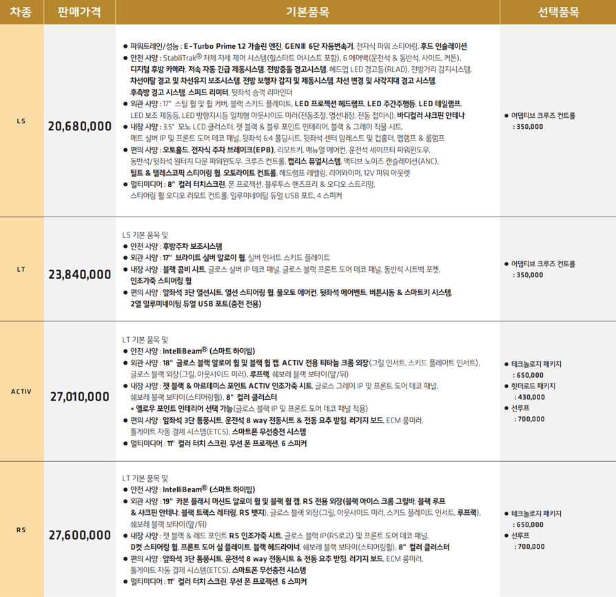 - LT 트림 (23,840,000 원) : LS 트림보다 메리트가 있는 건 열선시트, 스마트키, 버튼시동, 풀오토 에어컨, 후방주차 보조시스템이 있으며, 어댑티드 크루즈 컨트롤이 35만 원에 추가하실 수 있는 건 동일합니다.