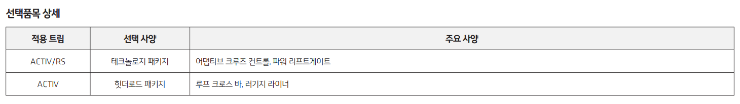 - ACTIV 트림 (27,010,000 원) : 가격이 확 오른 ACTIV 트림입니다. 개인적으로 블랙 휠이 가장 마음에 들고, 루프랙, 8" 컬러 클러스터, 통풍시트, 전동시트, 요추받침, 무선충전, 등 추가됩니다. 선택 옵션으로는 테크놀로지 패키지, 힛 더로드 패키지, 선루프가 있습니다.