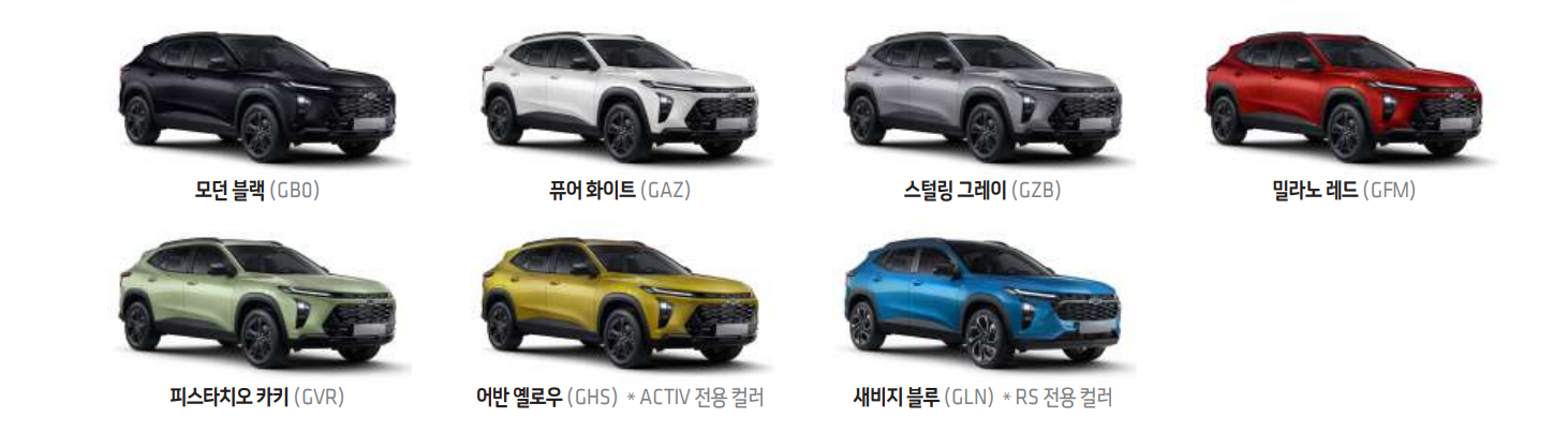 2024 트랙스 크로스오버의 외장 색상은 퓨어 화이트, 모던 블랙, 스털링 그레이, 밀라노 레드, 어반 옐로우, 피스타치오 카키, 새비지 블루 색상으로 총 7가지 색상을 선택하실 수 있습니다.