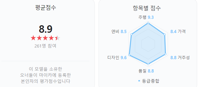 2024 SM6의 오너평가는 8.9점으로 상당히 높은 점수를 받고 있습니다.