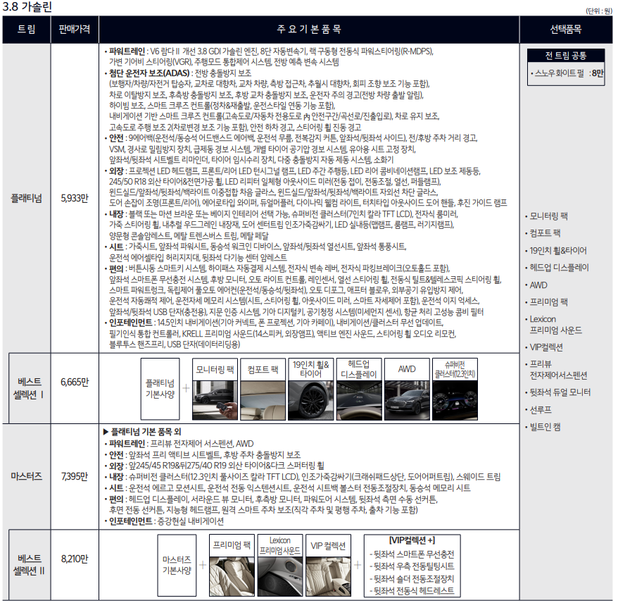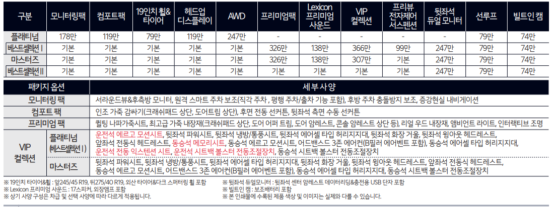 추가로 플래티넘과 마스터즈 트림의 가격 차이는 1,462만 원이나 차이 나기 때문에 가성비로 구매하시는 분들은 플래티넘, 최고등급을 원하시는 분들은 마스터즈를 선택하시면 될 것 같습니다!