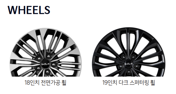 2024 K9의 휠은 18인치 전면 가공휠, 19인치 다크 스퍼터링 휠으로 구성되어 있습니다.