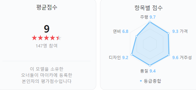 오너평가를 보시더라도 전반적으로 모든 면에 9점 이상을 받았지만 연비만 6.8점으로 아쉬운 점수를 받았습니다!