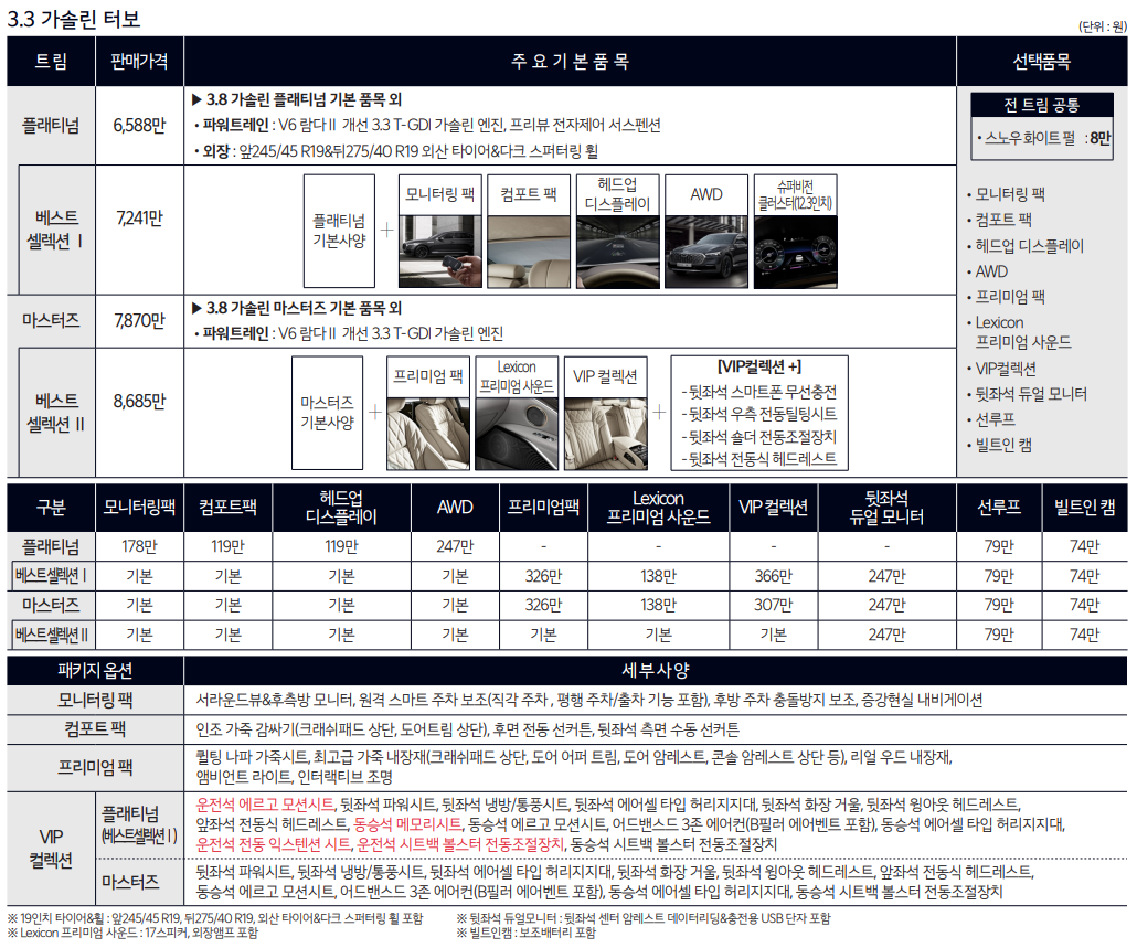3.3 가솔린 터보도 등급표를 올려두었으니 자산에 맞는 트림과 옵션을 알맞게 선택하여 후회 없이 차량 구매하시기 바랍니다.