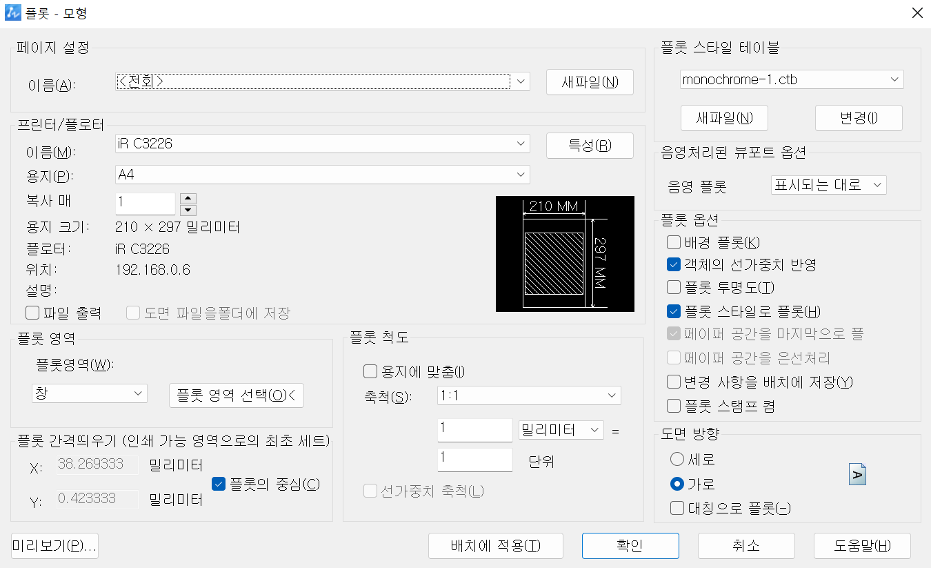 출력 : PLOT 명령어를 실행하여 용지크기, 프린터, 영역 설정을 해줍니다.