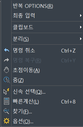 우선 우클릭이 안 되는 이유는 도면 영역의 바로 가기 메뉴에 체크가 해제되어 있어서 그렇기 때문에