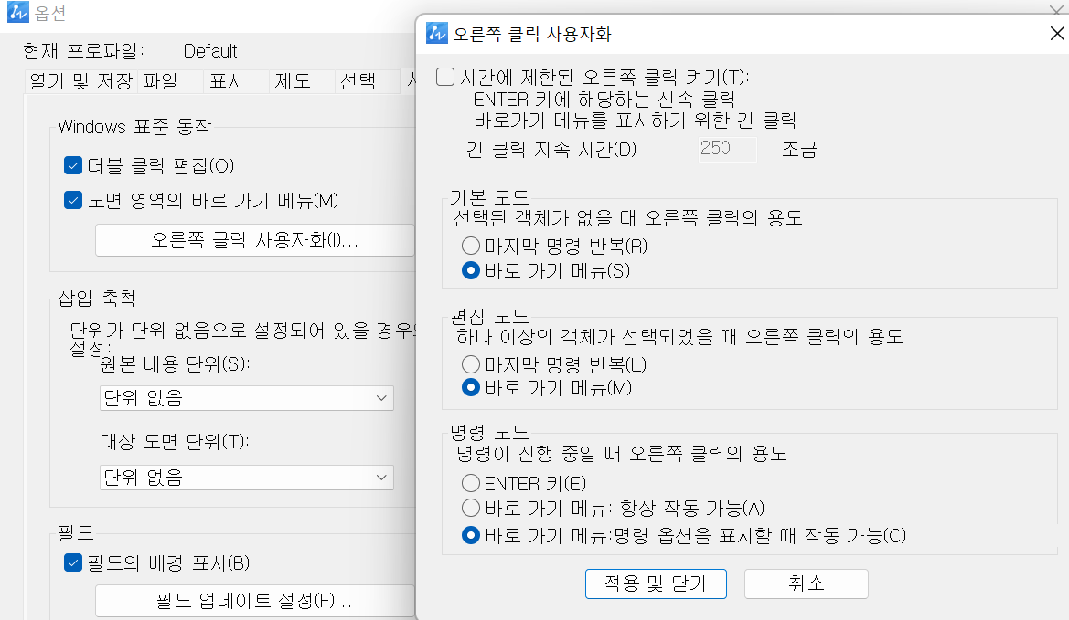 이상으로 오토캐드 우클릭이 안될 때 해결 방법(우클릭 설정 방법)에 대한 포스팅을 마치겠습니다.