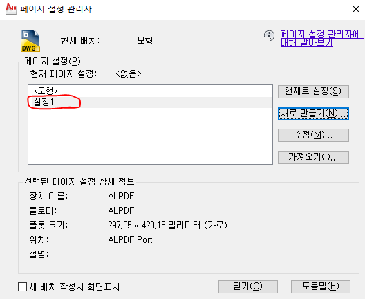 위 사진처럼 설정1이 생성되셨다면 출력 설정을 다 하신겁니다!