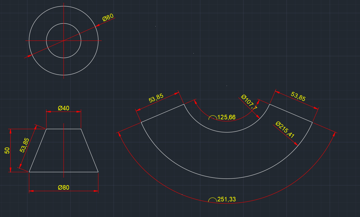 안녕하세요 오늘은 캐드로 원뿔을 전개하는 방법을 소개하려고 합니다! 원뿔은 참 전개할 일이 많죠 바로 시작하겠습니다 (전개 시간은 5분 이내입니다!) 그럼 응용을 해야 하니, 전개하는 방법을 같이 익혀보도록 하죠! 우선 아래와 같이 도면을 준비해 줍니다! 그럼 이제 원주율을 구해야 합니다! 원주율은 두 가지를 구할 겁니다! 원뿔(콘) 하단의 80파이입니다! 80x3.14159(파이) = 251.3272입니다 원뿔(콘) 상단의 40파이 계산입니다 40x3.14159(파이) = 125.6636입니다! 두 값을 이용해 보도록 하겠습니다 LEN 엔터 -> T(자르기) 엔터 -> 남길 호 길이 입력 (상단 계산) 사진 참조하셔서 자르시면 됩니다! 그리고 옆면 53.85부분도 양쪽 선을 이어줍니다 (초록색 선) 이..